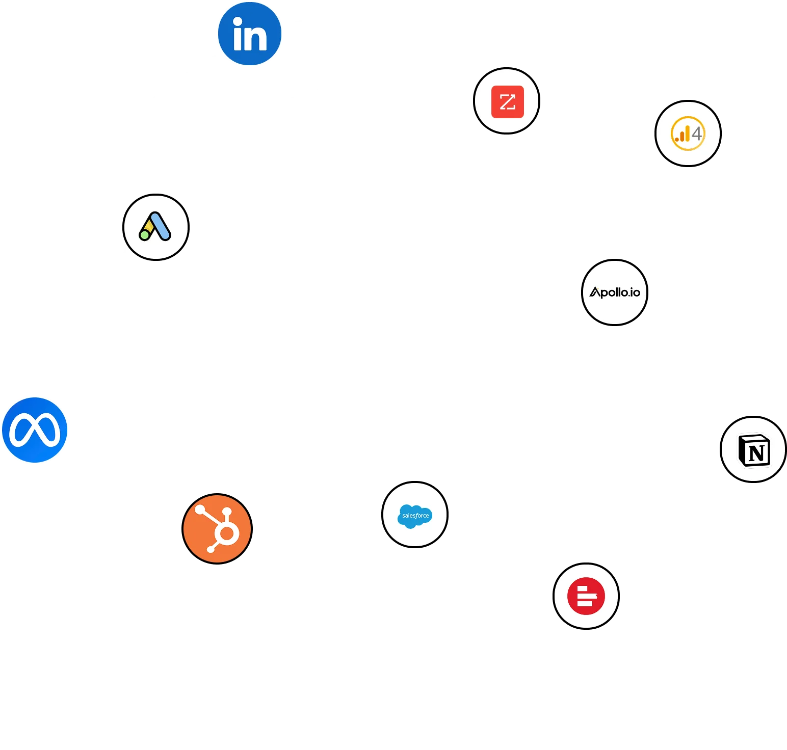 LinkedIn Ads · Google Ads · Meta Ads · HubSpot · Salesforce Apollo · ZoomInfo · GA4 · Tag Manager · Supermetrics · Notion Dashboards · Clay · Instantly